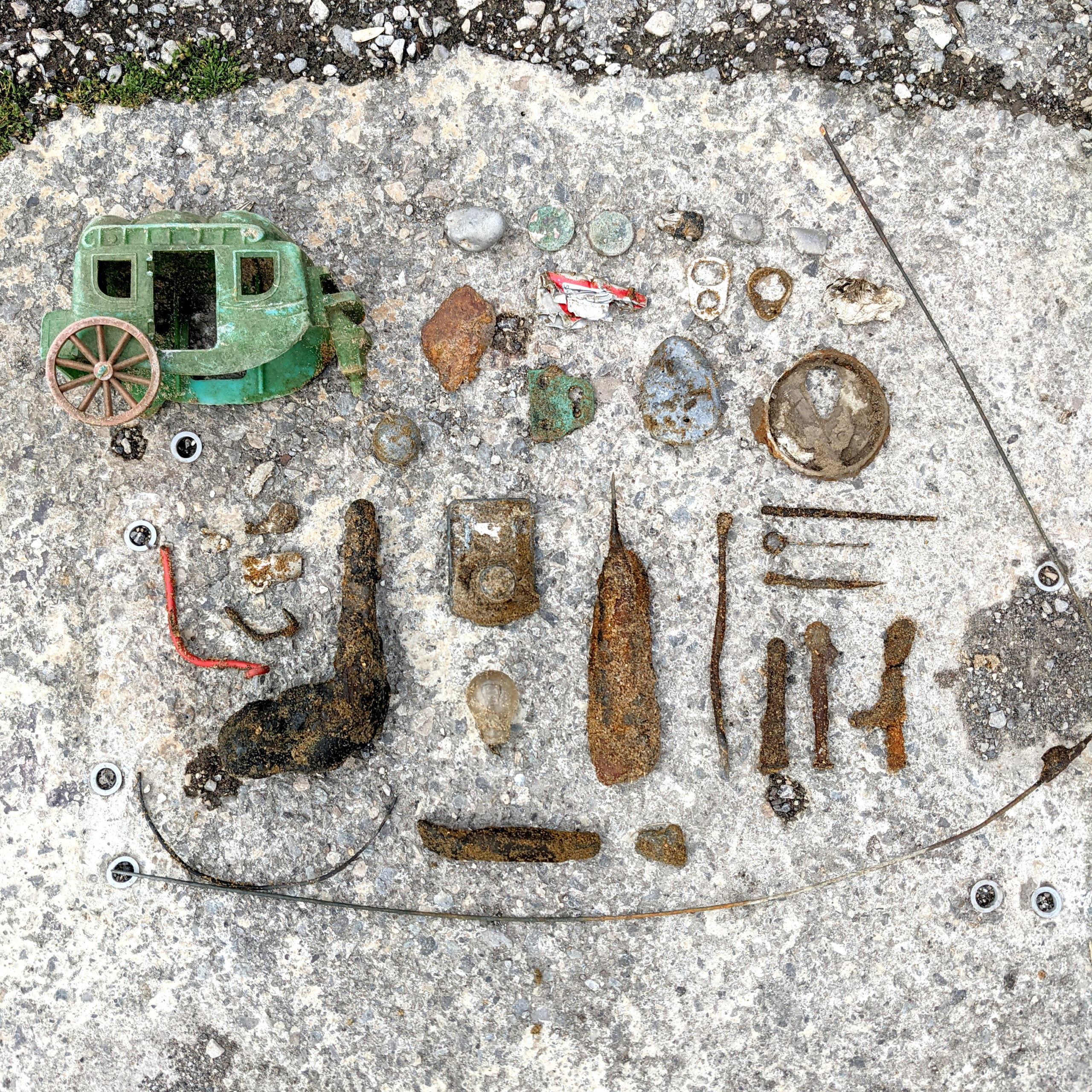 Nos detalla su última salida a la playa de Los Caballos, donde estuvo aproximadamente tres horas buscando, sondeando la arena, descubriendo la cantidad de basura metálica enterrada y recogiendo lo encontrado: “En la zona más alejada de la entrada, donde las rocas que se cubren en marea alta había restos de hierros, cables, clavos, tornillos, una bombilla, la cerradura de una puerta y pequeños metales sin identificar. En la parte de las rocas de la entrada, en la zona de pesca, varios pesos de plomo y dos monedas de pesetas. En la parte donde se acomodan los bañistas, ahí había de todo y en abundancia, latas, juguetes, anillas de latas y sobre todo papel albal”.